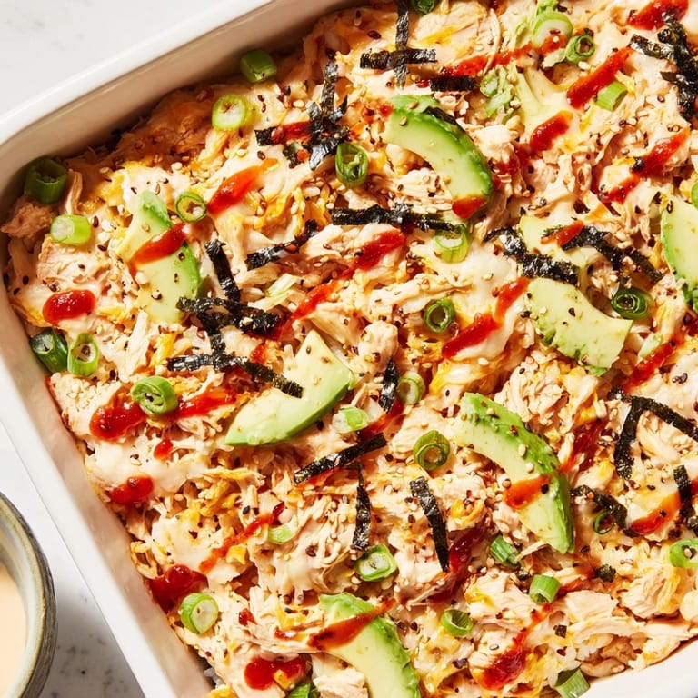 The beauty of this dish is how flexible it is once you understand the core idea. I've made it with diced cucumber mixed into the chicken layer for extra freshness, added pickled ginger for brightness, and even snuck in some crab for a different vibe. The framework stays the same, but you get to play with it and make it feel like yours. Some people add spicy mayo drizzle before baking, others layer cream cheese on the rice itself—whatever speaks to your palate is the right call.