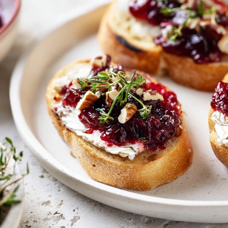Save Last December, I watched my sister arrange these little toasts on a white platter, each one glistening with cranberry sauce under the kitchen light. She'd been nervous about hosting her first holiday party, but the moment guests started reaching for seconds, her shoulders relaxed. I borrowed the recipe that night and haven't looked back since. There's something about the contrast—the warm, creamy cheese against the cool, tart cranberries—that feels both festive and effortless.